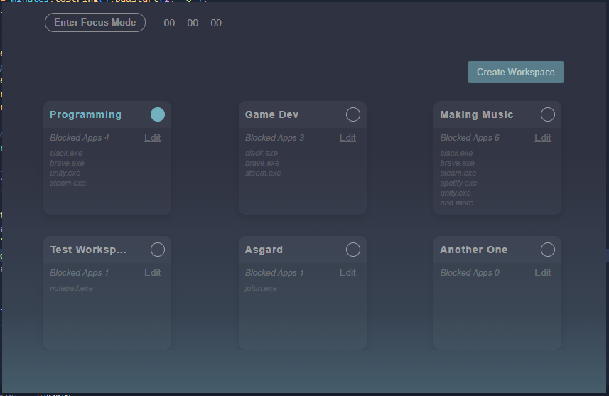 A productivity desktop application that allows the user to create workspaces with a list of blocked applications. Enter Focus Mode to then block those apps from being accessed, eliminating all distractions
